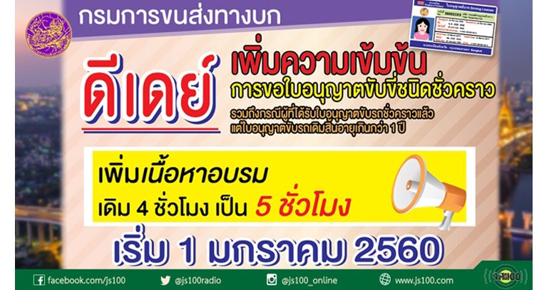 กรมการขนส่งทางบก ดีเดย์ 1 มกราคม 2560 ยกระดับมาตรฐานคุณภาพผู้ขับรถตามโครงการ Sure Driving/Smart Driver เพิ่มความเข้มข้น!!! พัฒนาหลักสูตรอบรมผู้ขอรับใบอนุญาต ขับรถชนิดชั่วคราวเป็น 5 ชั่วโมง เพื่อเพิ่มคุณภาพของผู้ขอรับใบอนุญาตขับรถ และลดปัญหาอุบัติเหตุทางถนนของประเทศ