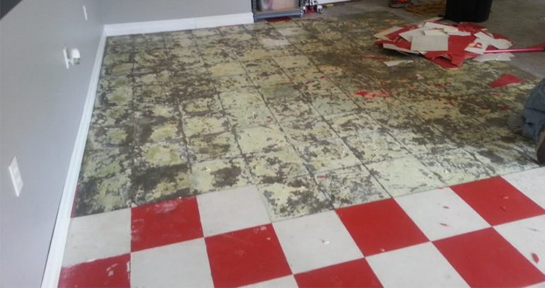 ขั้นตอนแรก เมื่ออุปกรณ์ต่างๆของท่านครบถ้วนดีแล้ว คือการรื้อ เริ่มจากนำผ้าขนหนูปูทับบนแผ่นที่ต้องการลอก แล้วเอาเตารีด (ที่เสียบปลั๊กพร้อมใช้งาน) กดถูให้ทั่วทั้งแผ่น ความร้อนจะทำให้กระเบื้องยาง เริ่มอ่อนตัวไปเรื่อยๆจนได้ที่ จากนั้นให้ใช้เหล็กแซะ ค่อยขูดลอก เพื่อเอาชิ้นกระเบื้องที่ชำรุดออกมาอย่างระมัดระวัง