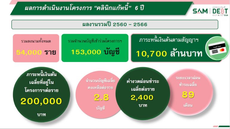 “คลินิกแก้หนี้ by SAM” เผยความสำเร็จปี 66 ลูกค้าหนี้เสียบัตรแห่สมัครทะลุเป้าหมาย ส่งผลยอดสะสมช่วยคนไทยแก้หนี้ ลดปัญหาหนี้ครัวเรือนของประเทศตลอด 6 ปีตั้งแต่เริ่มโครงการฯ สูงถึง 54,000 ราย คิดเป็นมูลหนี้รวมกว่า 10,000 ล้านบาท