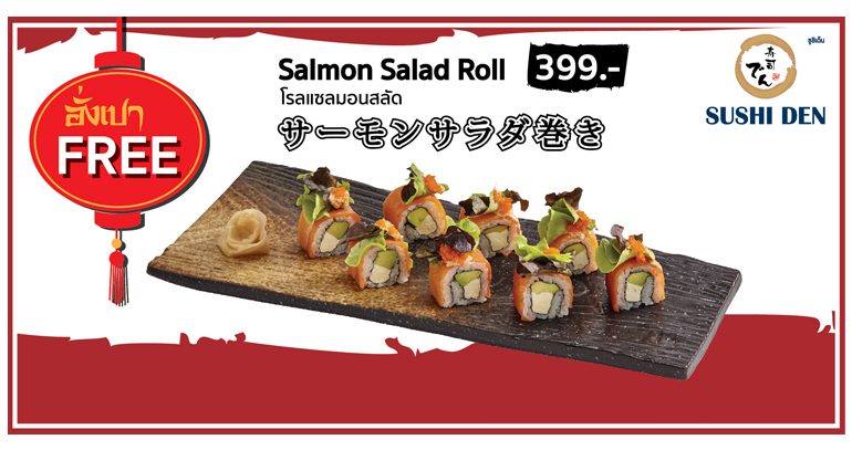 ร้านอาหารญี่ปุ่นซูชิ เด็น ผู้เชี่ยวชาญการทำซูชิคุณภาพเยี่ยม ในรูปแบบไคเต็น (Kaiten) หรือสายพานหมุน จัดโปรโมชั่นฉลองเทศกาลตรุษจีน เพียงรับประทานอาหารภายในร้านครบ 1000 บาทขึ้น รับคูปองอั่งเปา ฟรี! เมนูโรลแซลมอนสลัด มูลค่า 399.- (สำหรับใช้ในครั้งถัดไป) ตั้งแต่วันที่ 26-29 มกราคม 2560 ที่ร้านซูชิ เด็น ทุกสาขา..