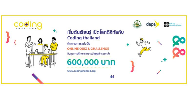 Coding Thailand โดย สำนักงานส่งเสริมเศรษฐกิจดิจิทัล (depa) กระทรวงดิจิทัลเพื่อเศรษฐกิจและสังคม เดินหน้าต่อยอดการเรียนรู้ด้านโค้ดดิ้ง (Coding) ผ่านกิจกรรม Coding Thailand Online Quiz & Challenge เปิดโอกาสเรียนรู้แบบสนุกๆ กับการแก้โจทย์ด้วยบล็อคโค้ด ผ่านแพลตฟอร์มออนไลน์ www.CodingThailand.org โดยกิจกรรมและการแข่งขันครั้งนี้มีจุดประสงค์เพื่อ ผลักดันให้เยาวชนและผู้สนใจได้รู้จักพื้นฐานของ Coding รู้จักการ ‘คิดเเบบมีตรรกะและกระบวนการ’ รวมถึงมีความคิดสร้างสรรค์ กล้าแสดงออก ได้แข่งขันเชิงสร้างสรรค์ ผ่านแพลตฟอร์มออนไลน์ที่ใครๆ ก็เข้าถึงได้ เพื่อให้เกิดการเรียนรู้เรื่องการ Coding ให้ แพร่หลาย และกระตุ้นการสร้างนวัตกรรมใหม่ๆ ที่เกิดจากการ Coding ในอนาคต