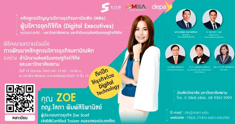 รศ.ดร.จอมพงศ์ มงคลวนิช คณบดีบัณฑิตวิทยาลัย สาขาบริหารธุรกิจ มหาวิทยาลัยสยาม เปิดเผยว่า สืบเนื่องจากความก้าวหน้าทางเทคโนโลยีและความต้องการบุคลากรด้านการบริหารในยุคดิจิทัลทำให้ทางมหาวิทยาลัยสยามได้พัฒนาหลักสูตรผู้บริหารยุคดิจิทัลร่วมกับสำนักงานส่งเสริมเศรษฐกิจดิจิทัล เกิดเป็นหลักสูตรใหม่ “หลักสูตรผู้บริหารยุคดิจิทัล” (MBA Digital Executives) เพื่อตอบสนองความต้องการของผู้บริหารยุคใหม่ที่ต้องใช้เทคโนโลยีในการบริหารจัดการองค์กรและเพิ่มขีดความสามารถในการแข่งขันทางธุรกิจ โดยงานนี้เป็นการลงนามความร่วมมือพัฒนาหลักสูตรร่วมกัน ซึ่งถือเป็นโอกาสอันดีในการสร้างความร่วมมือทางวิชาการกับสำนักงานส่งเสริมเศรษฐกิจดิจิทัล