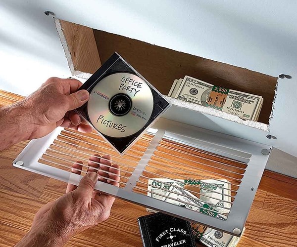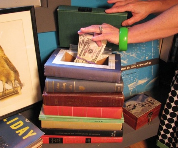 ลงทุนหลักร้อย แต่เก็บเงินได้หลักหมื่น ลองหาหนังสือเล่มหน้าๆ มาสักเล่ม แล้วซ่อนเงินไว้ตามหน้าต่างๆ แล้ววางซ้อนๆ รวมกับหนังสือเล่มอื่น แต่ต้องมั่นใจว่า ต้องเป็นเล่มที่เห็นแล้วไม่น่าหยิบอ่านด้วยล่ะ ไม่อย่างนั้นกลายเป็นว่า เราเตรียมเงินไว้ให้คุณโจรเรียบร้อยเลย