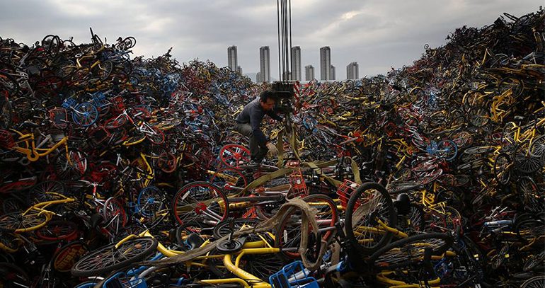 การใช้จักรยานในการเดินทางของประเทศจีน ถือว่าเป็นเรื่องปกติ ที่พบเห็นได้ทั่วไปตามท้องที่ต่างๆ ไม่ว่าจะเป็นเขตเมือง หรือ เขตชนบท ในทุกๆภูมิภาค แต่ความน่ากังวลก็คือ ความมหาศาลของจักรยาน ที่ไม่ได้ใช้แล้ว ดังที่ท่านกำลังจะได้เห็น นี่เป็นแค่ส่วนหนึ่งจากทั้งหมด ซึ่งขณะนี้ได้มี กลุ่มคนออกมารณรงค์ ให้มีการใช้จักรยานร่วมกัน เพราะถ้าหากต่างคนต่างซื้อ ต่างคนต่างทิ้ง ซากจักรยานจำนวนมหาศาล จะตกเป็นภาระของภาครัฐ หรือหน่วยงานที่ดูแลรับผิดชอบ สุดท้ายซากเหล่านี้ก็คงไม่พ้นเป็นมลพิษ อยู่กับคู่กับโลก