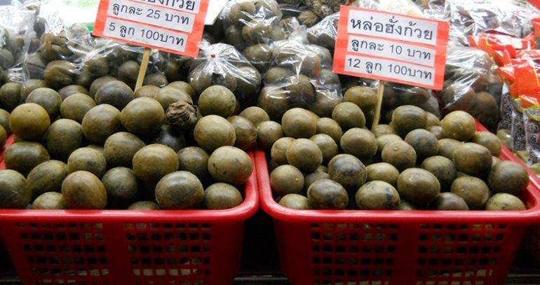 หล่อฮั้งก้วย มีแหล่งกำเนิดในแถบตอนใต้ของประเทศจีน และ ทางภาคเหนือของไทยเรา จัดอยู่ในหมวดของพืชสมุนไพรจีนชนิดหนึ่ง ผลมีลักษณะทรงกลมๆรีๆ ดูละม้ายไข่เป็ด ผิวเปลือกแข็งแต่มีความเปราะ ผลดิบจะมีสีเขียว และสีจะเขียวเข้มขึ้นไปเรื่อยๆตามระยะเวลา จนสุดท้ายผลจะออกสีน้ำตาลเข้มแกมดำเมื่อสุก