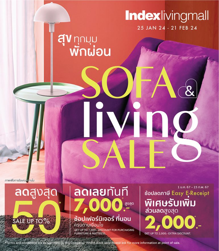 โดยงาน “SOFA & LIVING SALE” ปีนี้ได้รวม 2 เทศกาล ทั้ง “ตรุษจีน-วาเลนไทน์” ไว้ด้วยกัน โดยได้เนรมิตบรรยากาศภายใน สโตร์สีสันสดใส ภายใต้ธีมแห่งความรักและต้อนรับเทศกาลตรุษจีน เต็มอิ่มกับไอเทมเฟอร์นิเจอร์และของแต่งบ้านมากมาย สื่อความหมายที่ดีเป็นสิริมงคล เพื่อใช้ตกแต่งบ้านหรือเพื่อมอบเป็นของขวัญด้วยเฟอร์นิเจอร์ต่างๆ เช่น ชุดโต๊ะอาหาร, โซฟา และของตกแต่งบ้าน อาทิ รูปปั้นมังกร รูปปั้นม้า ชุดน้ำชาและชุดจานชาม รวมถึงกลุ่มอุปกรณ์ทำความสะอาดและจัดเก็บเพิ่มความเป็นระเบียบให้บ้าน พร้อมมอบโปรโมชั่นสุดคุ้ม เมื่อช้อปสินค้ารับส่วนลดสูงสุด 50% พิเศษ!!ลดเลยทันที 7,000 บาท เมื่อช้อปเฟอร์ฯ เอาใจสายมูกับเสี่ยงเซียมซีออนไลน์ (Seam-si digital) รับฟรี! คำทำนาย จากวัดกัลยาณมิตรวรมหาวิหาร (หลวงพ่อซำปอกง) เซียมซีแม่นๆ ที่เกิดขึ้นครั้งแรก ที่ วัดกัลยาณมิตร ธนบุรี ในรัชกาลที่ 5 พร้อมรับเพิ่ม Gift Voucher Lucky get free on top Discount มูลค่า 100 บาท, 200 บาท, 300บาท เฮงรับตรุษจีนรับ “สิงโตมหามงคล” เมื่อช้อปครบ 999 บาท (เฉพาะ 10-11 ก.พ. 67 เท่านั้น! จำนวนจำกัด) และ Workshop การจัดดอกไม้ สำหรับสมาชิก JOY Card เมื่อช้อปสินค้าครบ 15,000 บาท รับฟรี Flower in love มูลค่า 2,000 บาท ได้ อินเด็กซ์ ลิฟวิ่งมอลล์ เวลา 14.00-16.00 น. ที่สาขาราชพฤกษ์ วันที่ 3-4 ก.พ., สาขาบางนา วันที่ 14, 17-18 ก.พ. 67 , สาขาพัทยา, ภูเก็ต และเกษตร – นวมินทร์ วันที่ 14, 17-18 ก.พ.67 โดยสามารถเลือกแจกันที่หลากดีไซน์ให้แมทช์กับสไตล์ของผู้รับ และ Workshop การทำเทียนหอม และรับฟรี Candle in love มูลค่า 2,000 บาท ได้ที่ อินเด็กซ์ ลิฟวิ่งมอลล์ เวลา 14.00-16.00 น. ที่ สาขาอุดรธานี วันที่ 3-4 ก.พ. 67 , เชียงใหม่ วันที่ 10-11 ก.พ. 67 , รังสิต วันที่ 17-18 ก.พ. 67 พิเศษสมาชิกใหม่ JOY Card ฟรี!! รับส่วนลด 150 บาท พร้อมรับเพิ่ม 500 คะแนน แลกแต้มรับอั่งเปาเพิ่ม ใช้ 500 คะแนนแลกรับส่วนลด 150 บาท และ สิทธิพิเศษสมาชิก JOY Card ยิ่งแลกคะแนน ยิ่งได้ ลุ้นรับห้องพักอินเตอร์คอนติเนนตัล พัทยา รีสอร์ท ห้องจูเนียน สวีท พร้อมสิทธิ์เข้าคลับ วิวสวน จำนวน 2 วัน 1 คืน มูลค่า 31,000 บาท จำนวน 6 รางวัลรวมมูลค่า 186,000 บาท โดยสามารถนำ 20 คะแนน รับ 1 สิทธิ์ลุ้นรางวัล 50 คะแนนรับ 3 สิทธิ์ลุ้นรางวัล 100 คะแนน รับ 10 สิทธิ์ลุ้นรางวัล เริ่มตั้งแต่ 25 ม.ค.67-21 ก.พ. 67