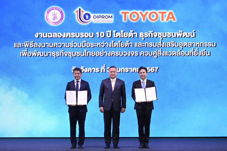 นายบรรจง สุกรีฑา รองปลัดกระทรวงอุตสาหกรรม นายภาสกร ชัยรัตน์ อธิบดีกรมส่งเสริมอุตสาหกรรม นายนันทวัฒน์ ศรีวรัตน์อัชกุล ผู้ช่วยกรรมการผู้จัดการใหญ่ บริษัท โตโยต้า มอเตอร์ ประเทศไทย จำกัด พร้อมด้วยคณะเจ้าหน้าที่จากกรมส่งเสริมอุตสาหกรรม และคณะผู้บริหารระดับสูง บริษัท โตโยต้า มอเตอร์ ประเทศไทย จำกัด ร่วมเป็นเกียรติภายในงานฉลองความสำเร็จครบรอบ 10 ปี โครงการโตโยต้าธุรกิจชุมชนพัฒน์ และพิธีลงนามบันทึกข้อตกลงความร่วมมือกับกรมส่งเสริมอุตสาหกรรม กระทรวงอุตสาหกรรม เพื่อยกระดับ การพัฒนาธุรกิจชุมชนไทยอย่างครบวงจร ควบคู่สิ่งแวดล้อมที่ยั่งยืน ณ TOYOTA ALIVE เมื่อวันอังคารที่ 30 มกราคม 2567 ที่ผ่านมา