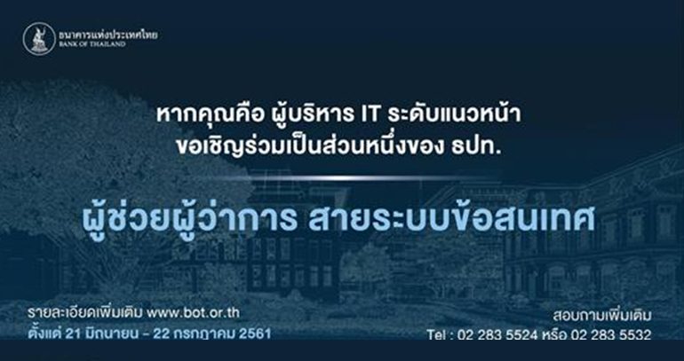 ธนาคารแห่งประเทศไทย (ธปท.) ประสงค์รับสมัครบุคคลที่มีความรู้ความสามารถเพื่อมาร่วมงานขับเคลื่อนยุทธศาสตร์ด้านเทคโนโลยีสารสนเทศของ ธปท. ตลอดจนพัฒนาโครงสร้างพื้นฐานด้านระบบการชำระเงิน ระบบข้อมูลและ cyber security ในระบบการเงินการธนาคารของประเทศ โดยมีความรับผิดชอบหลัก ดังนี้