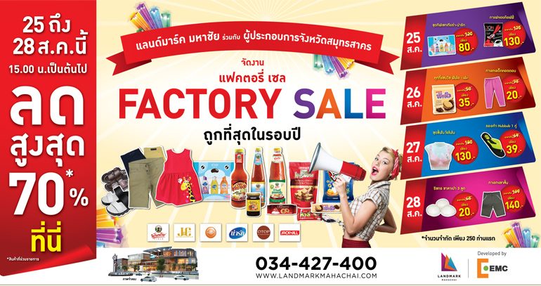 โครงการ “แลนด์มาร์ค มหาชัย” ไลฟ์สไตล์มอลล์แห่งใหม่ใจกลางเมืองมหาชัย จังหวัดสมุทรสาคร พัฒนาโดยบริษัท อีเอ็มซี จำกัด (มหาชน) หรือ EMC ร่วมกับผู้ประกอบการโรงงานและธุรกิจต่างๆ ในท้องถิ่นมหาชัยและจังหวัดสมุทรสาครจัดงาน “Factory Sale” มหกรรมการจัดจำหน่ายสินค้าราคาพิเศษถูกที่สุดในรอบปี ทั้งสินค้าอุปโภคบริโภค อาหารสำเร็จรูป เสื้อผ้า รวมทั้งผลิตภัณฑ์ OTOP ของดีประจำจังหวัดสมุทรสาคร ฯลฯ ที่ร่วมใจกันยกขบวนมอบส่วนลดสูงสุดถึง 70% พร้อมแจกคูปองส่วนลดต่อที่ 2 เพิ่มจำนวนจำกัดเท่านั้น ! … แวะไปช้อปกันได้ที่บริเวณหน้าโครงการแลนด์มาร์ค มหาชัย ถนนนิคมรถไฟ จังหวัดสมุทรสาคร ในวันพฤหัสบดีที่ 25 – อาทิตย์ที่ 28 สิงหาคม 2559 ตั้งแต่เวลา 15.00 น. เป็นต้นไป