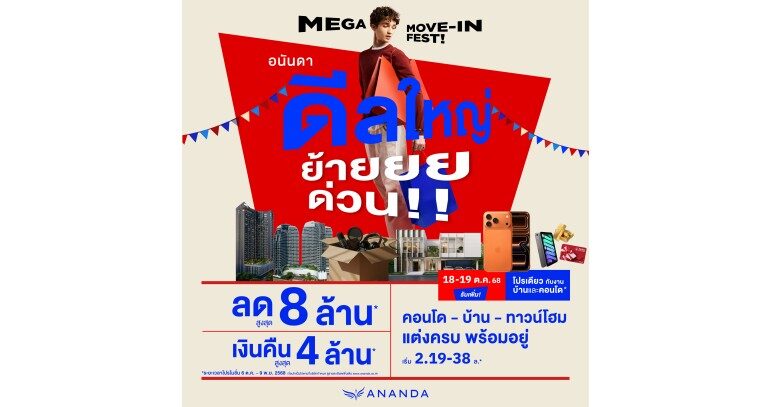 บริษัท อนันดา ดีเวลลอปเม้นท์ จำกัด (มหาชน) หรือ ANAN ผู้นำแห่งวงการพัฒนาที่อยู่อาศัยสำหรับคนเมือง ครองตำแหน่งผู้นำตลาดคอนโดมิเนียมติดรถไฟฟ้า มุ่งมั่นพัฒนาที่อยู่อาศัยเพื่อตอบโจทย์ชีวิตคนเมืองได้อย่างลงตัวที่สุด เดินหน้าปลุกตลาดอสังหาริมทรัพย์ในช่วงโค้งสุดท้ายของปี 2568 เปิดตัวแคมเปญ #ดีลใหญ่ย้ายด่วน ช่วงเวลาที่ดีที่สุดในการย้ายเข้าโครงการพร้อมอยู่ นำเสนอโครงการคอนโดมิเนียม บ้าน และทาวน์โฮม ที่อยู่อาศัยพร้อมอยู่กว่า 18 โครงการ มอบโปรโมชั่นสุดพิเศษ อาทิ รัAบส่วนลดสูงสุด 8 ล้านบาท* รับเงินคืนสูงสุด 4 ล้านบาท* แต่งครบ* พร้อมอยู่* เริ่ม 2.19 – 38 ล้านบาท* ตั้งแต่วันนี้ ถึง 9 พฤศจิกายน 2568 นี้ พิเศษเฉพาะลูกค้าที่จองภายในวันที่ 18 – 19 ตุลาคม 2568 มั่นใจเป็นทางเลือกที่ดีที่สุดสำหรับผู้บริโภคที่กำลังมองหาที่อยู่อาศัยในช่วงปลายปีนี้