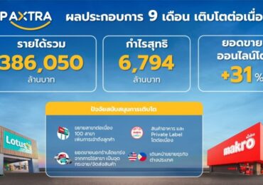 ซีพี แอ็กซ์ตร้า เผยผลประกอบการ 9 เดือนเติบโตต่อเนื่อง ทำรายได้รวม 386,050 ล้านบาท กำไรสุทธิ 6,794 ล้านบาท ยอดขายออนไลน์โตก้าวกระโดด 31% ตอกย้ำ “ผู้นำ Grocery E-Commerce Platforms” ของไทย