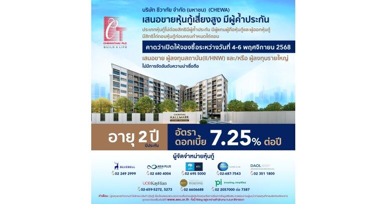“CHEWA หวังว่าการออกหุ้นกู้ในครั้งนี้จะได้รับความสนใจจากผู้ลงทุนเหมือนครั้งที่ผ่านมา บริษัทฯ ขอขอบคุณท่านนักลงทุนทุกท่านที่ให้ความไว้วางใจและสนับสนุนการดำเนินงานของเราอย่างต่อเนื่อง แม้ในภาวะตลาดที่มีความท้าทาย บริษัทฯ ยังคงมุ่งมั่นในการบริหารโครงการอสังหาริมทรัพย์อย่างมีประสิทธิภาพ