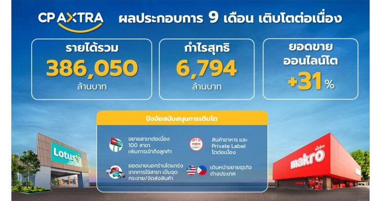 บริษัท ซีพี แอ็กซ์ตร้า จำกัด (มหาชน) (บริษัทฯ หรือ CPAXT) ผู้ดำเนินธุรกิจค้าส่งค้าปลีก แม็คโคร-โลตัส เผยผลประกอบการ 9 เดือนของปี 2568 เติบโตแข็งแกร่ง ด้วยรายได้รวม 386,050 ล้านบาท และมีกำไรสุทธิ 6,794 ล้านบาท สะท้อนศักยภาพในการขับเคลื่อนธุรกิจอย่างมั่นคงจากทั้งธุรกิจค้าส่งและค้าปลีก โดยได้รับแรงหนุนจาก