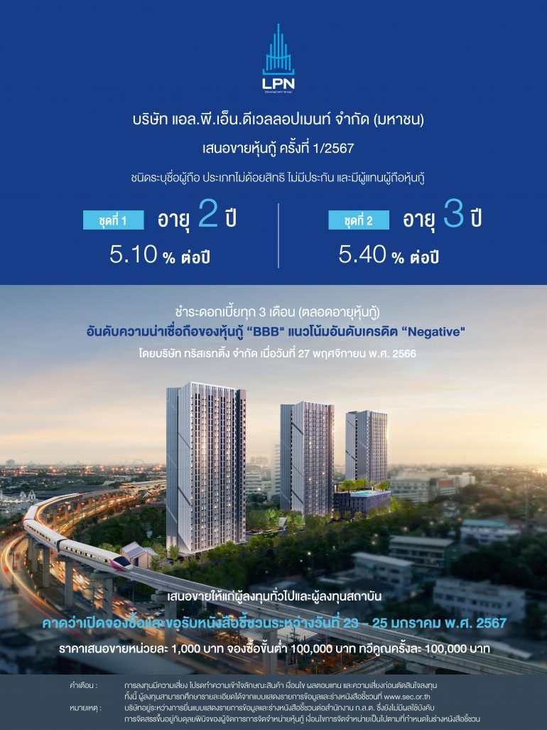 LPN เตรียมเสนอขายหุ้นกู้ชุดใหม่ ชูผลตอบแทน 5.10 – 5.40% ต่อปี คาดเปิดจองซื้อ 23 – 25 มกราคมนี้