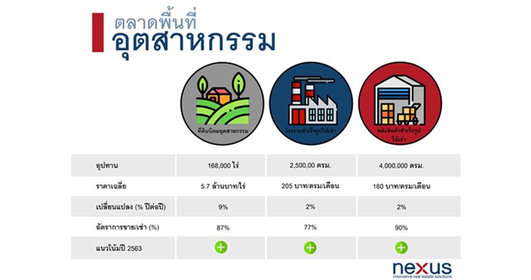 เน็กซัสสำรวจภาพรวมตลาดพื้นที่อุตสาหกรรมปี 2562 ที่ผ่านมา พบว่ายังคงมีแนวโน้มการเติบโตอย่างต่อเนื่อง ผลจากการผลักดันของภาครัฐ อีกทั้งโครงการอีอีซีที่เริ่มมีความชัดเจน ทั้งในเรื่องของพื้นที่ สิทธิประโยชน์ และความคืบหน้าของโครงการโครงสร้างพื้นฐาน ส่งผลให้เกิดการซื้อขายที่ดินในเขตอุตสาหกรรมอย่างต่อเนื่อง อย่างดีลใหญ่จากอาลีบาบามูลค่ากว่า 3 พันล้านบาท เมื่อปลายปี ที่สามารถสร้างความคึกคักให้กับตลาดได้เป็นอย่างดี