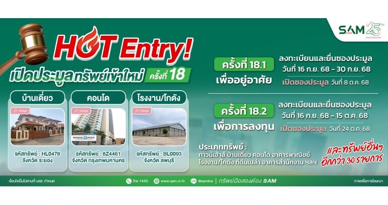 SAM เปิดประมูลทรัพย์มือสองทำเลดีทั่วไทย กว่า 447 ลบ. ไฮไลท์เด่นโรงงาน/โกดังขนาดใหญ่ลพบุรี เกือบ 150 ไร่ พร้อมทรัพย์เพื่อที่อยู่อาศัยราคาดีอีกมากมาย