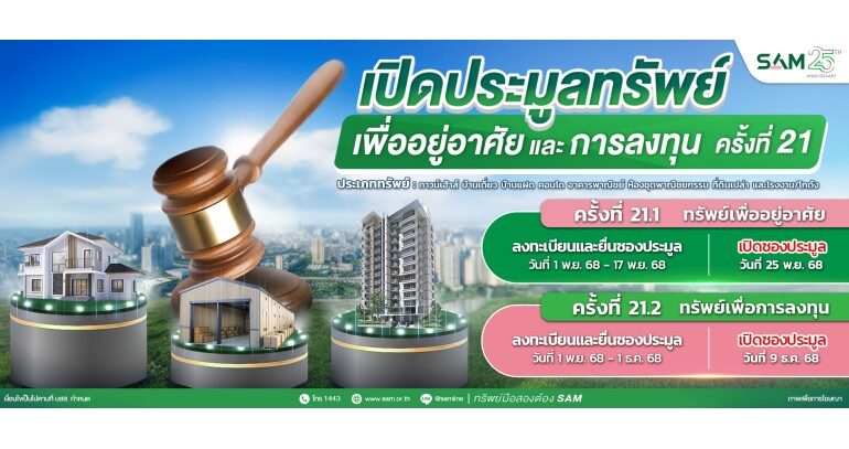ทั้งนี้ ผู้สนใจเข้าร่วมประมูลสามารถลงทะเบียนและยื่นซองประมูล พร้อมเอกสารประกอบการประมูลที่กำหนด โดยทรัพย์เพื่อที่อยู่อาศัยและเพื่อการลงทุน ราคาไม่เกิน 20 ลบ. (ครั้งที่ 21.1/2568) ภายในวันที่ 17 พ.ย. 2568 และกำหนดเปิดซองประมูลวันที่ 25 พ.ย. 2568 ส่วนทรัพย์ที่มีราคาสูงกว่า 20 ลบ. (ครั้งที่ 21.2/2568) ภายในวันที่ 1 ธ.ค. 2568 และกำหนดเปิดซองประมูลวันที่ 9 ธ.ค. 2568 เวลา 10.00 น. เป็นต้นไป ที่สำนักงานใหญ่ SAM อาคารซันทาวเวอร์ส ถ.วิภาวดีรังสิต กรุงเทพฯ หรือสอบถามรายละเอียดเพิ่มเติมได้ที่ Call Center 1443 และดูรายละเอียดทรัพย์สินได้ทางเว็บไซต์ที่ www.sam.or.th รวมทั้งช่องทางออนไลน์ที่หลากหลายและสะดวกรวดเร็ว โดยแอด ID Line @Samline ติดตาม Facebook /YouTube / TikTok ได้ที่ “SAM บริหารสินทรัพย์สุขุมวิท” เพื่อติดตามข้อมูลข่าวสารดี ๆ จาก SAM