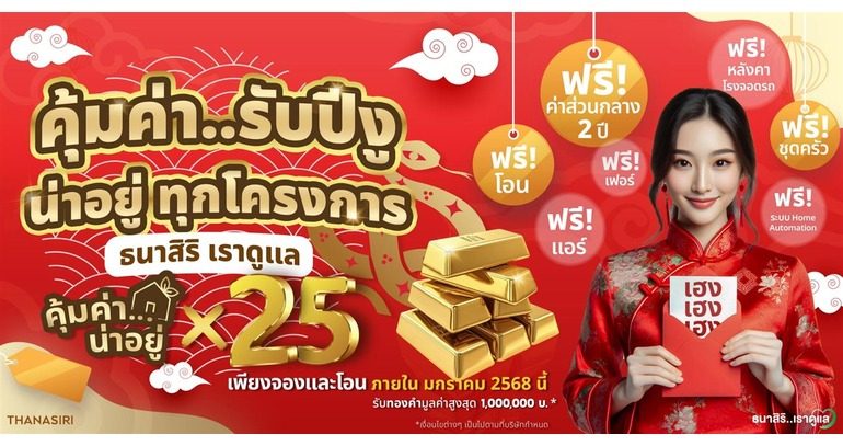 ธนาสิริ กรุ๊ป ส่งความสุข x25 ฉลองปีใหม่ ปัดหมุดพิกัดบ้านสวย คุ้มค่า น่าอยู่ ราคาดี กับบ้านเดี่ยว บ้านแฝด ทาวน์โฮม 12 โครงการคุณภาพ จัดแคมเปญ “คุ้มค่า .. รับปีงู น่าอยู่ทุกโครงการ” เพื่อเป็นของขวัญให้กับคุณตลอดเทศกาลความสุข เมื่อจอง และโอนกรรมสิทธิ์ ภายในเดือนมกราคมนี้ ลุ้นรับทองคำแท่งสูงสุดกว่า 1 ล้านบาท* พร้อมอัดแน่นสิทธิพิเศษมากมาย