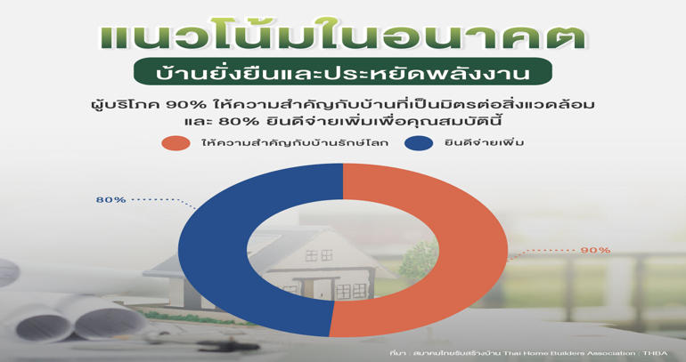 นายนิรัญ นายกสมาคม ชี้ให้เห็นอีกว่า เทรนด์บ้านยั่งยืนและประหยัดพลังงาน กำลังได้รับความสนใจอย่างก้าวกระโดดจากผู้บริโภค โดยผลสำรวจล่าสุดพบว่า ผู้บริโภคกว่า 90% ให้ความสำคัญกับบ้านที่เป็นมิตรต่อสิ่งแวดล้อม และกว่า 80% ยินดีที่จะจ่ายเงินเพิ่มขึ้นเพื่อบ้านที่มีคุณสมบัติเหล่านี้ การตัดสินใจนี้ได้รับแรงผลักดันจากความตระหนักต่อภาวะโลกร้อน (Climate Change) ที่มากขึ้น รวมถึงความต้องการที่จะลดภาระค่าใช้จ่ายในระยะยาว โดยเฉพาะอย่างยิ่งค่าไฟฟ้าที่สูงขึ้น (ที่มา: ศูนย์ข้อมูลอสังหาริมทรัพย์)