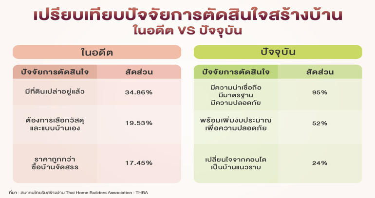 สมาคมไทยรับสร้างบ้าน (Thai Home Builders Association: THBA) วิเคราะห์สถานการณ์ตลาดรับสร้างบ้านในอดีตถึงปัจจุบัน เผยให้เห็นถึงการเปลี่ยนแปลงเชิงพฤติกรรมของผู้บริโภคที่สำคัญ โดยมีการเปลี่ยนผ่านจากปัจจัยที่ขับเคลื่อนด้วยราคาและงบประมาณ ไปสู่การให้ความสำคัญกับปัจจัยเชิงคุณค่าและความมั่นคงในระยะยาวอย่างชัดเจน ในปัจจุบันผู้บริโภคให้ความสำคัญสูงสุดกับความคุ้มค่าและคุณภาพการก่อสร้างบ้าน ซึ่งรวมถึงความน่าเชื่อถือของผู้ประกอบการเป็นอันดับแรก ตามมาด้วยความสามารถในการบริหารจัดการงบประมาณ และพื้นที่ใช้สอยที่ยืดหยุ่นได้